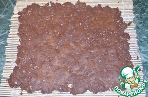 Выкладываем шоколадный слой на растянутую пищевую плёнку. Я плёнку положила на бамбуковый коврик для суши, чтобы удобнее было потом заворачивать рулет.