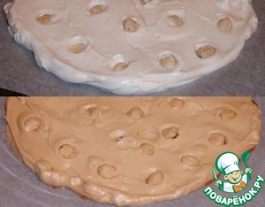 Чертим на пергаменте круг диаметром 19 см. Оформляем белковую массу и в духовку. Первые 30 минут температура 150С, далее час и более при температуре 100С.