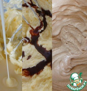 Я очень люблю шифоновые бисквиты (с добавлением жидкости и масла). Они вредные при выпечке, но вкусные и не нуждаются в обильной пропитке. Итак, 4 яйца делим на желтки (+180 г сахара, взбиваем добела) и белки (+щепотка соли и взбиваем до пиков и перламутрового блеска). Затем в желтки вливаем масло, взбиваем, следом жидкость, взбиваем, всыпаем разрыхлитель теста, разбалтываем массу, всыпаем просеянную муку, еще раз размешиваем до однородности. -