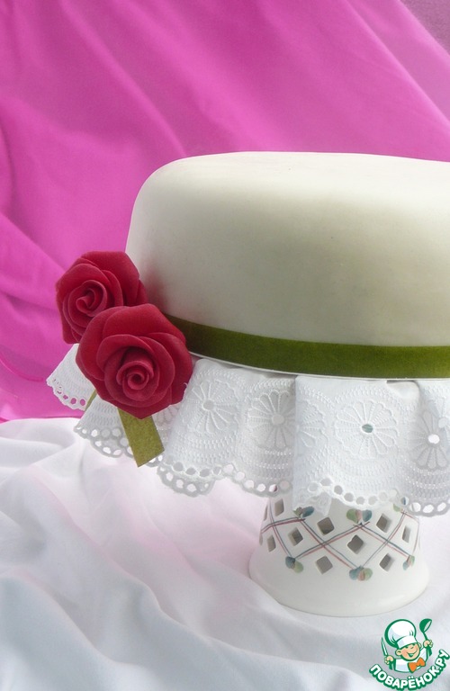 Как я покрывала торт мастикой, можно посмотреть в рецепте самой шокомастики (http://www.povareno k.ru/recipes/show/84 847/ пробел в ссылке убираем). С оформлением у меня все скромно. Я обернула тортик бумажной лентой и закрепила парочку мастичных розочек. Тортик готов! Приглашаю всех на виртуальное чаепитие!