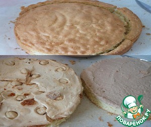Бисквит легко разрезала на 4 коржа, прослаивала 2 разными кремами + пропитка.