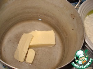 Займемся заварным тестом. В кастрюльку добавим воду и сливочное масло. Поставим на огонь и доведем до кипения.