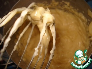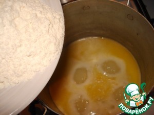 Всыпим всю муку, на небольшом огне, энергично помешивая, оставим смесь, пока она не загустеет и будет отставать от стенок и дна кастрюльки.