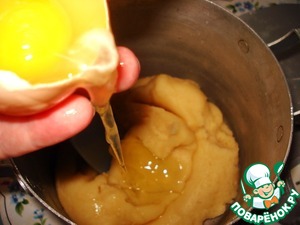 По одному разобьем яйца, хорошо размешивая после каждого.