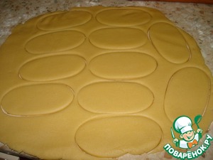 Достанем песочное тесто и раскатаем в прямоугольник толщиной 5 мм. Вырежем овалы.