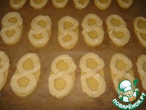 Заварное тесто переложим в кондитерский мешок и сверху песочных овалов сделаем восьмерки из заварного теста.