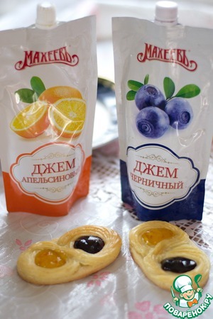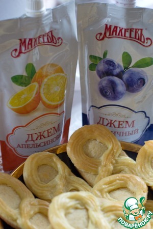 Половину восьмерочек заполняем черничным джемом, вторую половину - апельсиновым. Очень удобно использовать джем в мягкой упаковке от фирмы Махеевъ с дозатором – можно быстро и аккуратно украсить все печенье.
