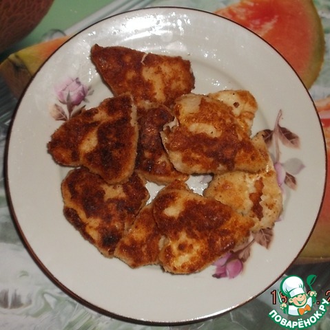 Разрезаем остывшую массу на ломтики или как я - вырезаем формочкой. Смачиваем наши гренки в белке, обваливаем в панировочных сухарях и обжариваем на растительном масле.