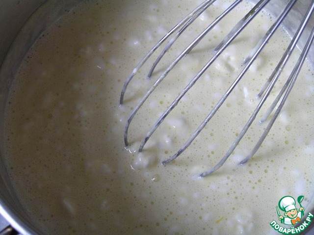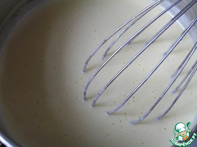 Тонкой струйкой влить горячие сливки в желтки с сахаром, постоянно помешивая венчиком.