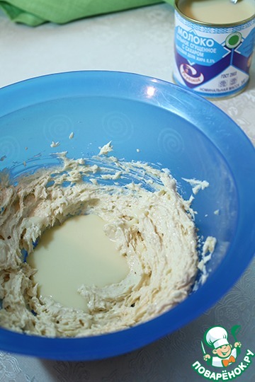 Добавляем сгущёнку, снова взбиваем.