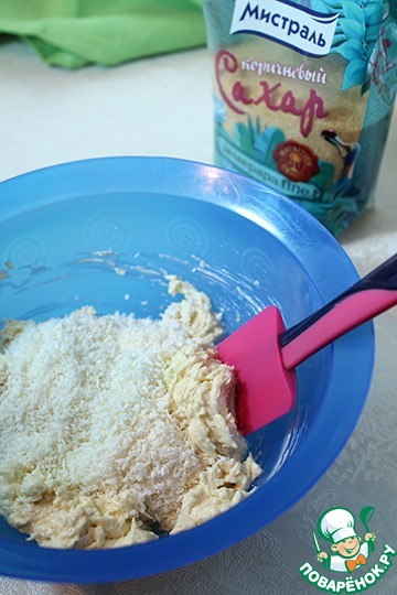 Всыпаем кокосовую стружку, хорошо перемешиваем.