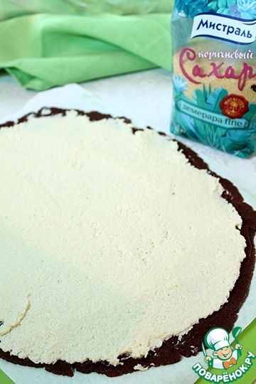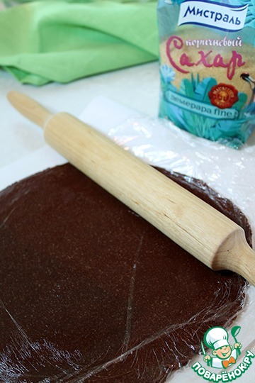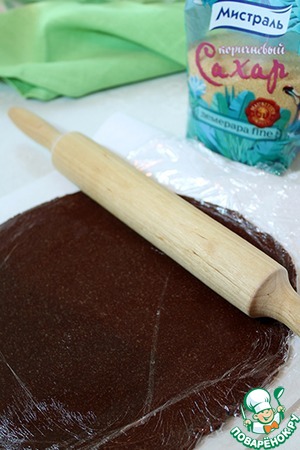 Шоколадное тесто выложить на бумагу для выпечки, сверху накрыть пищевой плёнкой. Раскатать в тонкий пласт, толщина 3-4 мм. У меня масса получилась довольно мягкая, я убрала на 5 минут в морозилку.