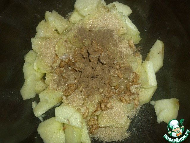 Яблоки очищаем от кожуры и семечек, нарезаем на мелкие ломтики. Соединяем яблоки, сахар, корицу, орехи и по рецепту ром все перемешиваем.