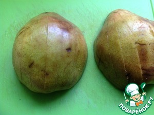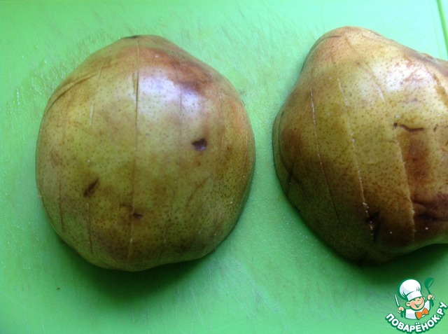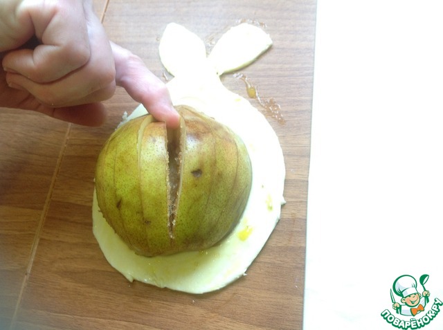 Грушу очистить от сердцевины и сделать разрезы, но не до конца, как на фото