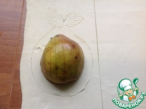 Тесто раскатать слегка и разделить на 2 части, положить половинку груши и ножом сделать контур в виде груши, как на фото, отступив 2 см от края теста