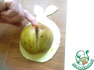 В прорези груши насыпать сахара мистраль. Тесто смазать желтком и посыпать сахаром. Отправить в духовку на 15 мин