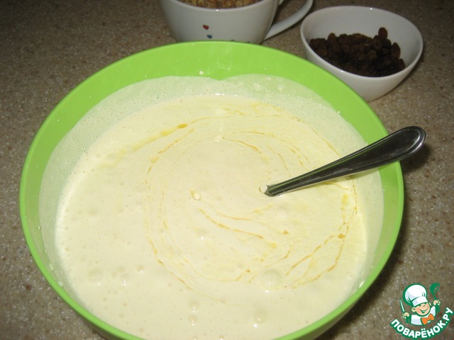 Добавляем растопленное сливочное масло (не горячее!!!) и перемешиваем.