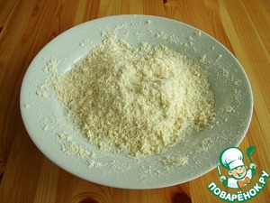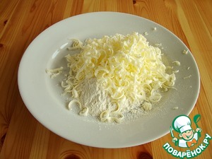 Для тарта я приготовила песочное тесто. Муку просеяла в тарелку, смешала с солью и сахаром и сверху натерла мороженое сливочное масло.