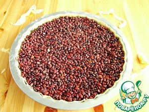Обрезала лишнее тесто, кое-где наколола вилкой, засыпала в форму фасоль и выпекала в разогретой духовке при 180С 15 минут. Затем удалила фасоль и пекла еще около 7 минут.