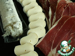 Пока пеклась основа для тарта, я подготовила начинку. У меня был сыр типа Бри в виде цилиндра и мягкий козий сыр. В следующий раз я бы вместо козьего взяла пару головок моцареллы, уж слишком солоновато с козьим на мой вкус. Ну и, конечно, слайсы пармской ветчины.