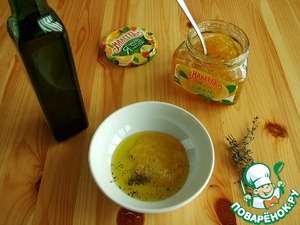 Для соуса цитронет я взяла 2 ложки лимонного джема Махеев, 3 ложки оливкового масла холодного отжима, пару маленьких веточек сушеного тимьяна и щепотку смеси перцев. Думаю, также неплохо было бы с чили (чуть-чуть) для любителей острого. Всё смешала.