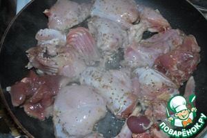Разогреть сковороду и обжарить куски кролика на растительном масле до золотистой корочки.