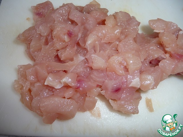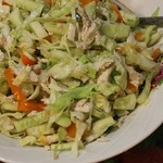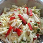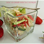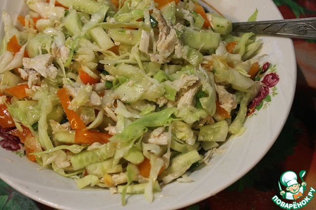 Полезный и вкусный салат из свежей капусты, болгарского перца и нежного куриного мяса.