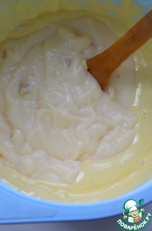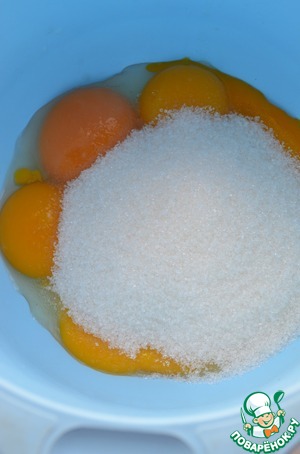 Отделить желтки от белков. Желтки взбить с сахаром в пышную, светлую пену