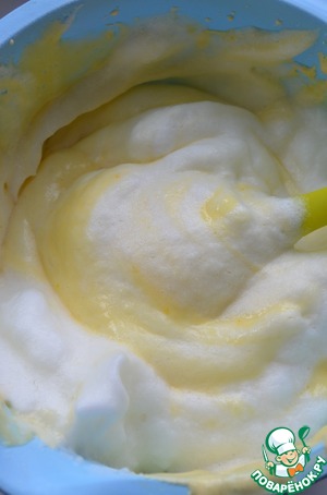 Отдельно взбить в пену белки. Добавить в желтки муку с разрыхлителем, затем йогурт, цедру лимона и лимонный сок 1 ст. л., перемешать до однородности