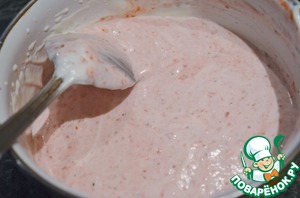 В оставшийся крем добавьте 1/3 клубничного пюре и хорошо размешайте до однородного цвета.