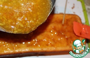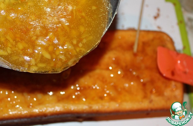 В готовом пироге сделать отверстия палочкой и залить теплым джемом.
