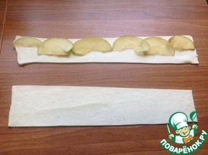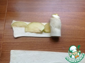 Тесто раскатать и нарезать полосками шириной 5 см, выложить яблоки, как на фото