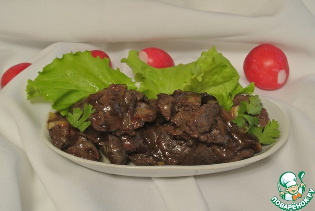 Печень обмыть, зачистить пленки и нарезать небольшими кусочками