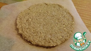 • Выложить основу на пекарскую бумагу в форме круга. Поставить в духовку. Готовая основа будет золотистого цвета. Кстати, если увеличить пропорции для основы, то у вас получится очень вкусное печенье) Достаем нашу основу. Пахнет уже очень вкусно и соблазнительно) Но мы стоически терпим и продолжаем нашу готовку. Замочить в воде желатин согласно инструкции. У меня ушло 20 мл воды и около 20 минут для набухания.