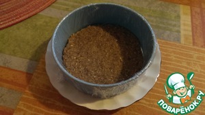 • Форму для застывания чизкейка обернуть пищевой пленкой. На дно положить основу. Я посыпала основу мелконарезанной курагой. Выложить начинку.