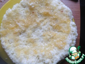 Бисквит остудить, положить на него тарелку и обрезать. Обрезки поломать произвольно и сложить в тарелку. Обрезанный корж разрезать пополам, получается 2 коржа, нижний корж смазать 4 ст. л. лимонного джема Махеев