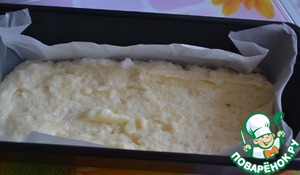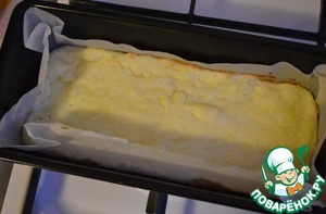 Застелить форму промасленным пергаментом, выложить массу и отправить в духовку на 25 минут. Tемпература - 180 градусов; духовку сильно не разогревать, иначе сильно прихватится верх и образуется сухая корочка, а низ может пригореть. После 10 минут можно чуть добавить температуру.