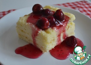 Для вишневого соуса: вишню очистить от косточек, вскипятить, добавить сахар и заварить крахмалом густой кисель. Oстудить. Бубертc нарезать на квадраты, сложить (по желанию) кусочки в два-три "этажа", полить вишневым соусом.