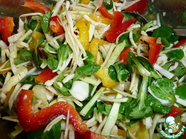 Капусту нашинковать, перец нарезать соломкой, салат нарвать.