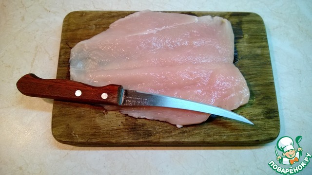 Куриное филе разрезать на две половинки вдоль. Если делать большие шарики, то половинки разрезать не до конца и развернуть филе, как на фото.