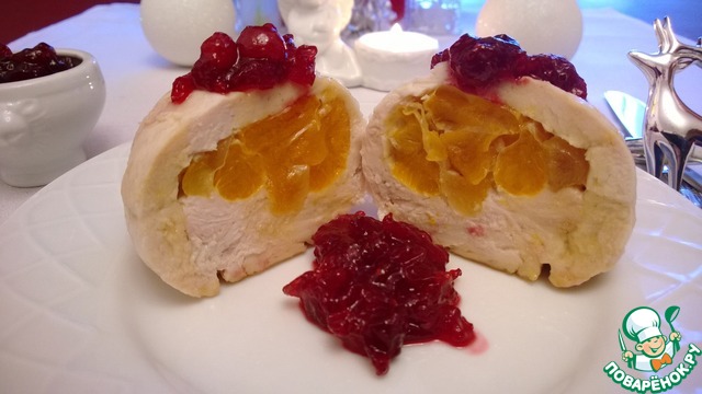 Представляю вам рецепт очень вкусных куриных шариков с начинкой из мандаринов и кураги под клюквенным соусом.