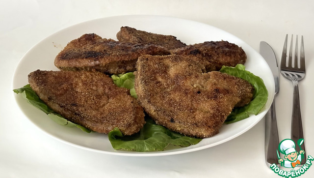 Быстро выкладываем панированные куски печени на сковороду. Жарим с одной стороны ровно 1, 5 минуты, переворачиваем и еще 1, 5 минуты. Выключаем огонь, накрываем крышкой и даем постоять еще 3 минуты.