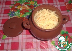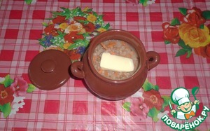 Выкладываем массу в горшочек. Сверху кладем кусочек масла.