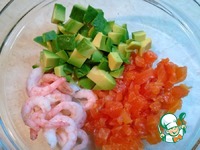 Нарезаем форель, авокадо, апельсин на кубики, добавляем креветки и рукколу. |