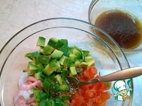 Готовим заправку. Соевый соус смешать с медом, горчицей и лимонным соком, тщательно перемешать. Добавить оливковое масло. Заправка готова. |