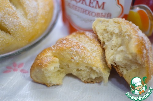 В тесто для таких булочек добавляют повидло, джем. Здесь успех во многом определяет характеристика джема - именно от него зависит и аромат, и цвет, и вкус булки, поэтому рекомендую использовать светлые: яблочное, грушевое, абрикосовое, персиковое. Я пекла с облепиховым джемом от Махеевъ.