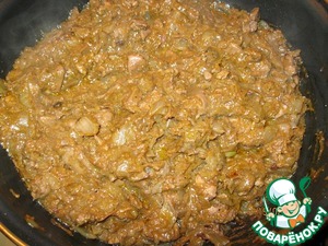 Затем печеночную начинку, которую предварительно смешали с половиной желтков