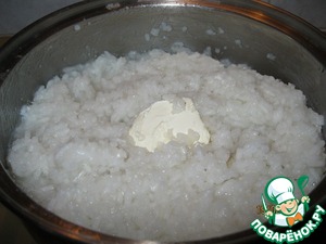 Дно формы смазать маслом, посыпать молотыми сухарями, выложить рис ровным слоем