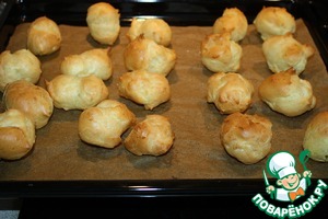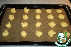 Готовое тесто выкладываем двумя ложками на смазанный растительным маслом противень примерно с грецкий орех, расстояние нужно делать значительное, т. к. тесто увеличивается в объеме. Духовку нагреваем до 200 градусов. Ставим на дно духовки емкость с горячей водой и наши шарики