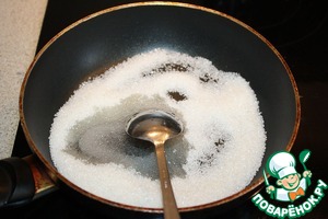 Сахар и воду варим до светло-коричневой массы, получается карамель. Т. к. я была дома одна, мне удалось заснять только начальный этап варки карамели. Снимаем карамель с огня.